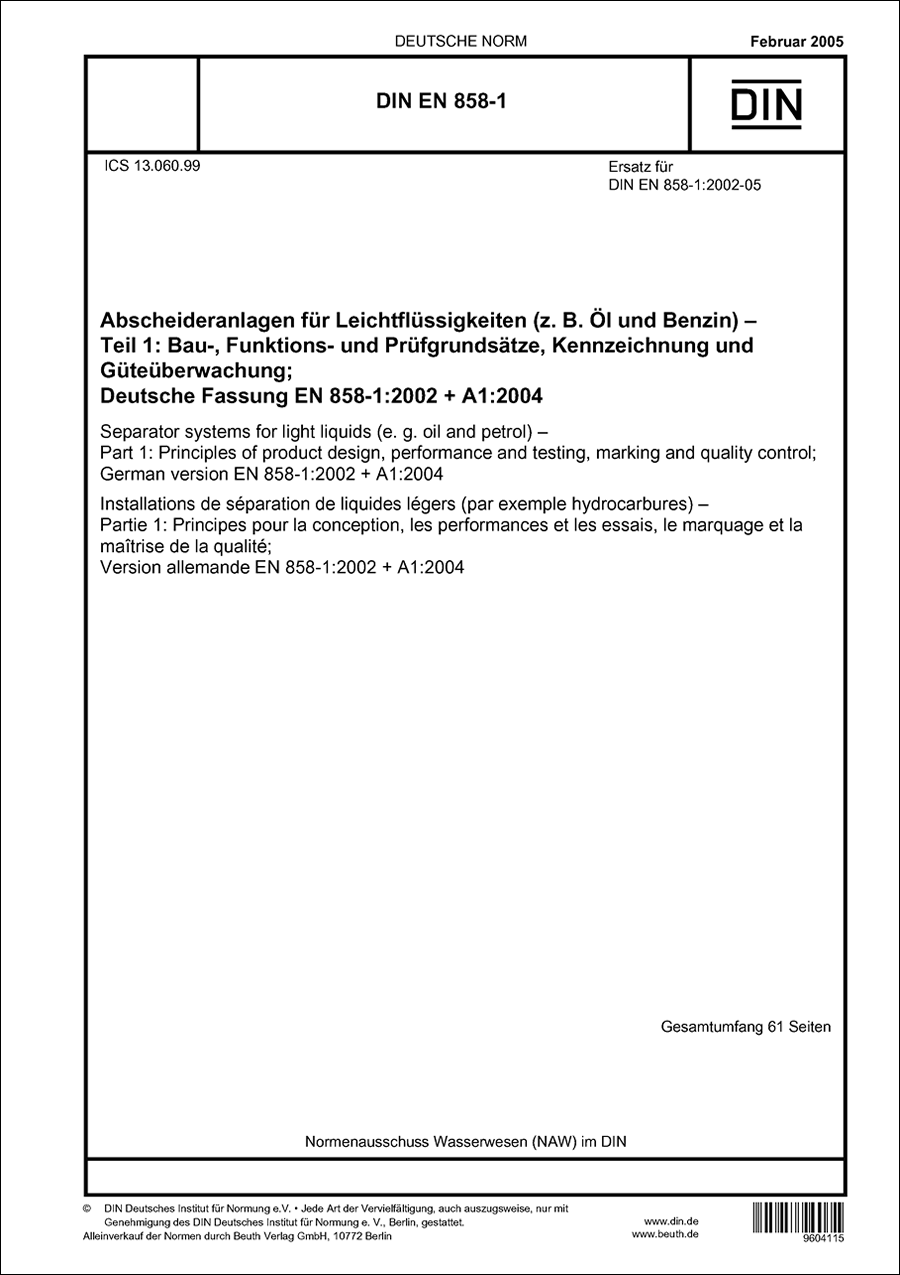 DIN EN 858-1 - Abscheideranlagen für Leichtflüssigkeiten (z. B. Öl und Benzin) - Teil 1: Bau-, Funktions- und Prüfgrundsätze, Kennzeichnung und Güteüberwachung mit Änderung A1 - Februar 2005