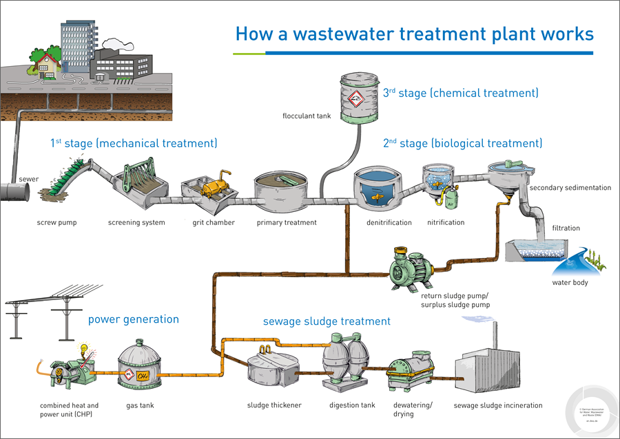 The poster illustrates the course of wastewater through a wastewater treatment plant. The technical wastewater structures such as grit chamber, primary treatment, aeration tank, secondary sedimentation and digestion tank are shown schematically and briefly defined. For anyone who wants to explain the stages of wastewater treatment, an aid to illustrate the individual process stages in a wastewater treatment plant.
